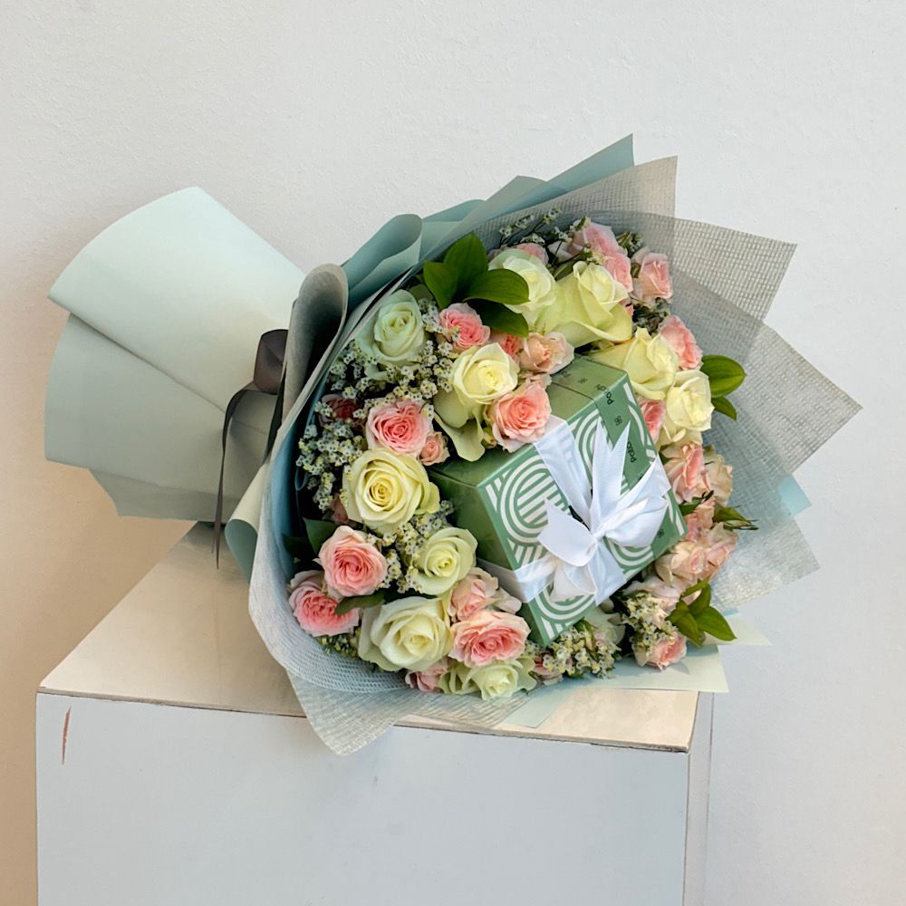 تنسيقة عيد الأم الأنيقة تضم مزيجًا ساحرًا من الورود الطبيعية الجذابة مع عبوة عطر فاخر تضيف لمسة من الأناقة والرقي. هدية مثالية لتكريم الأمهات وإبراز مدى حبك وتقديرك.