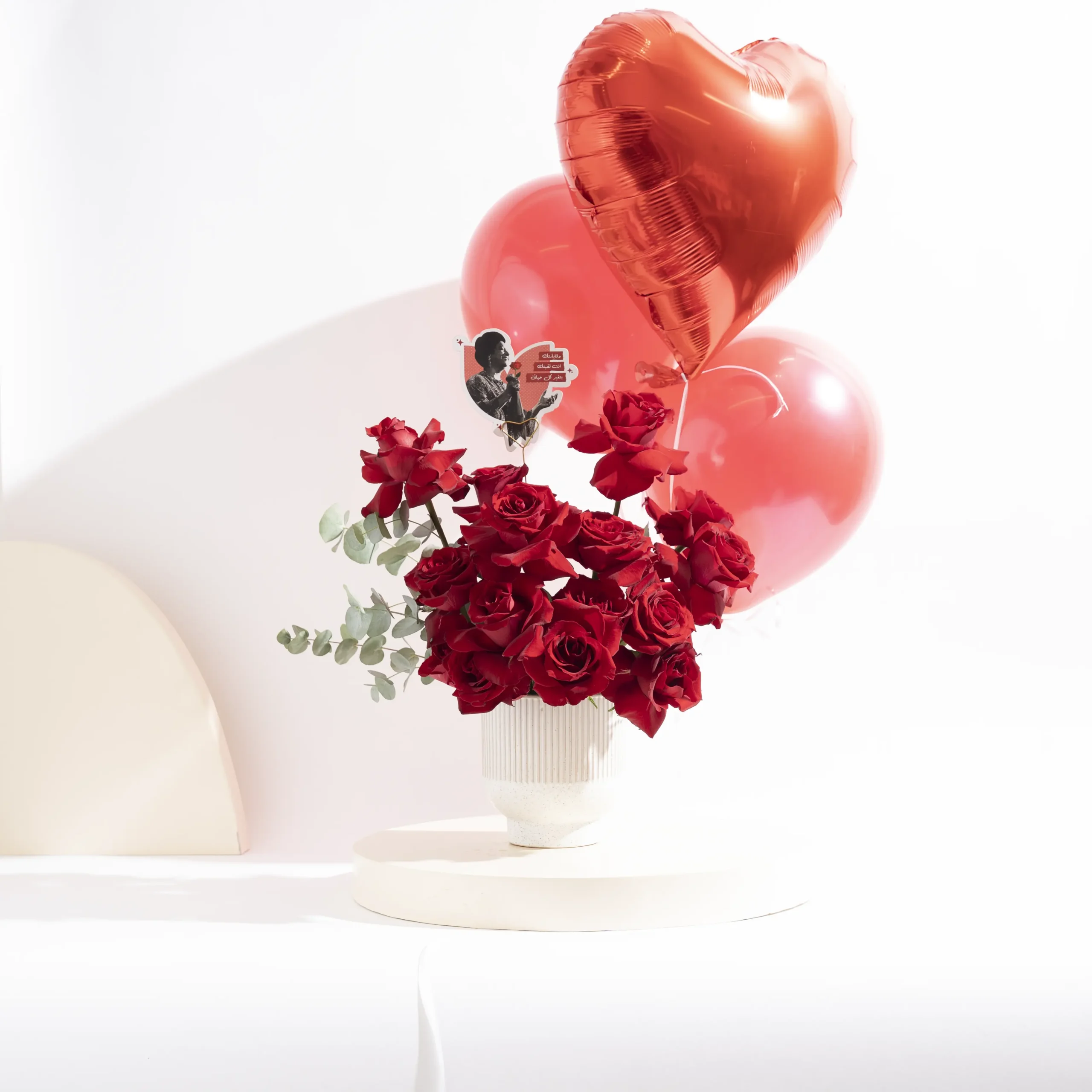 تتألق الورود الحمراء في باقة جميلة داخل مزهرية بيضاء أنيقة ، تضفي على المشهد لمسة من الرومانسية والفخامة ، تتخللها أوراق الأوكالبتوس الخضراء، مما يضفي شعورًا بالانتعاش والتجدد ، مرفق معها ثلاث بالونات حمراء واحدة على شكل قلب أحمر ،، هذه التوليفة الرائعة تعتبر هدية مثالية للتعبير عن الحب والمشاعر العميقة، وتجعل عيد الحب مناسبة لا تُنسى مليئة بالدفء والعاطفة.