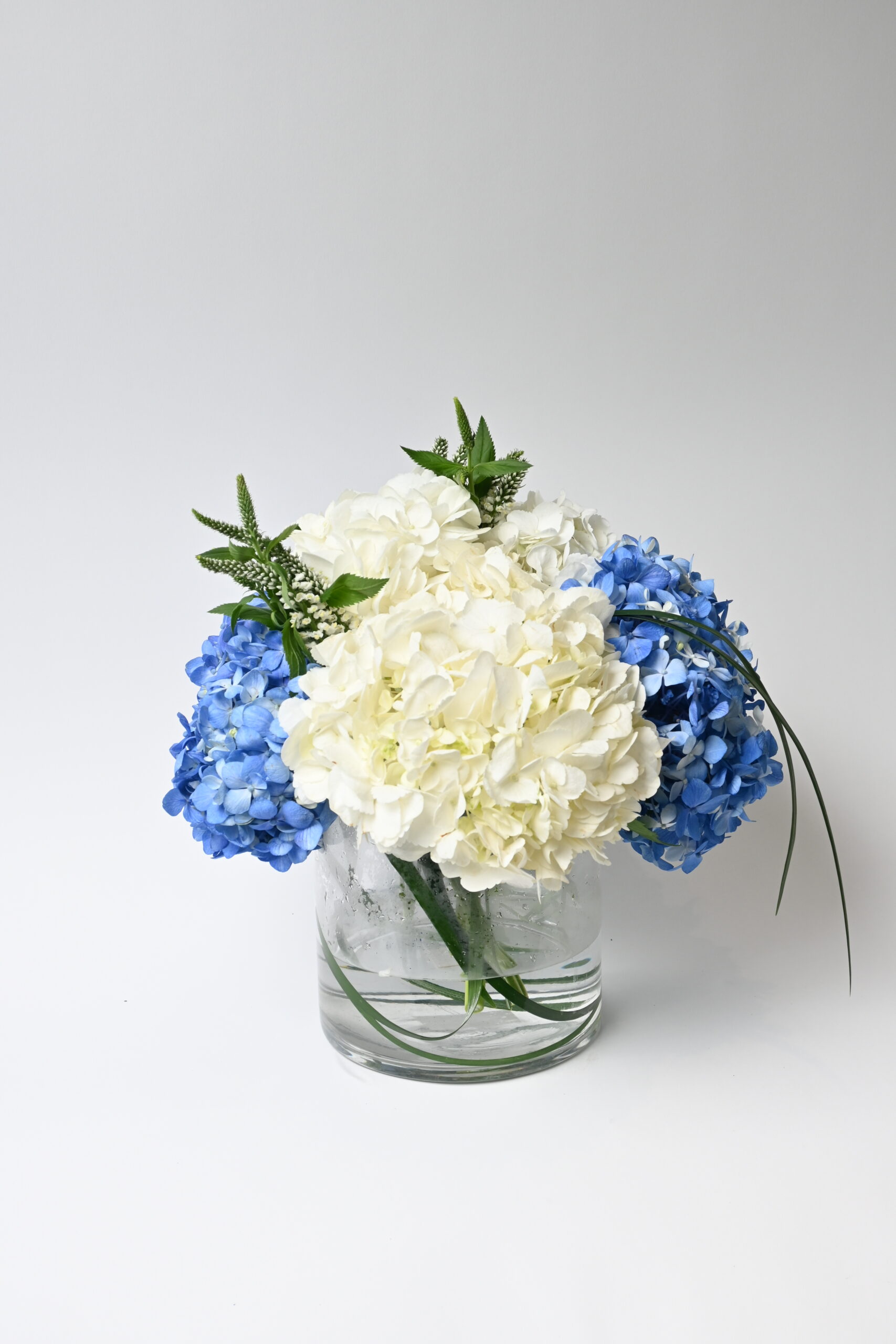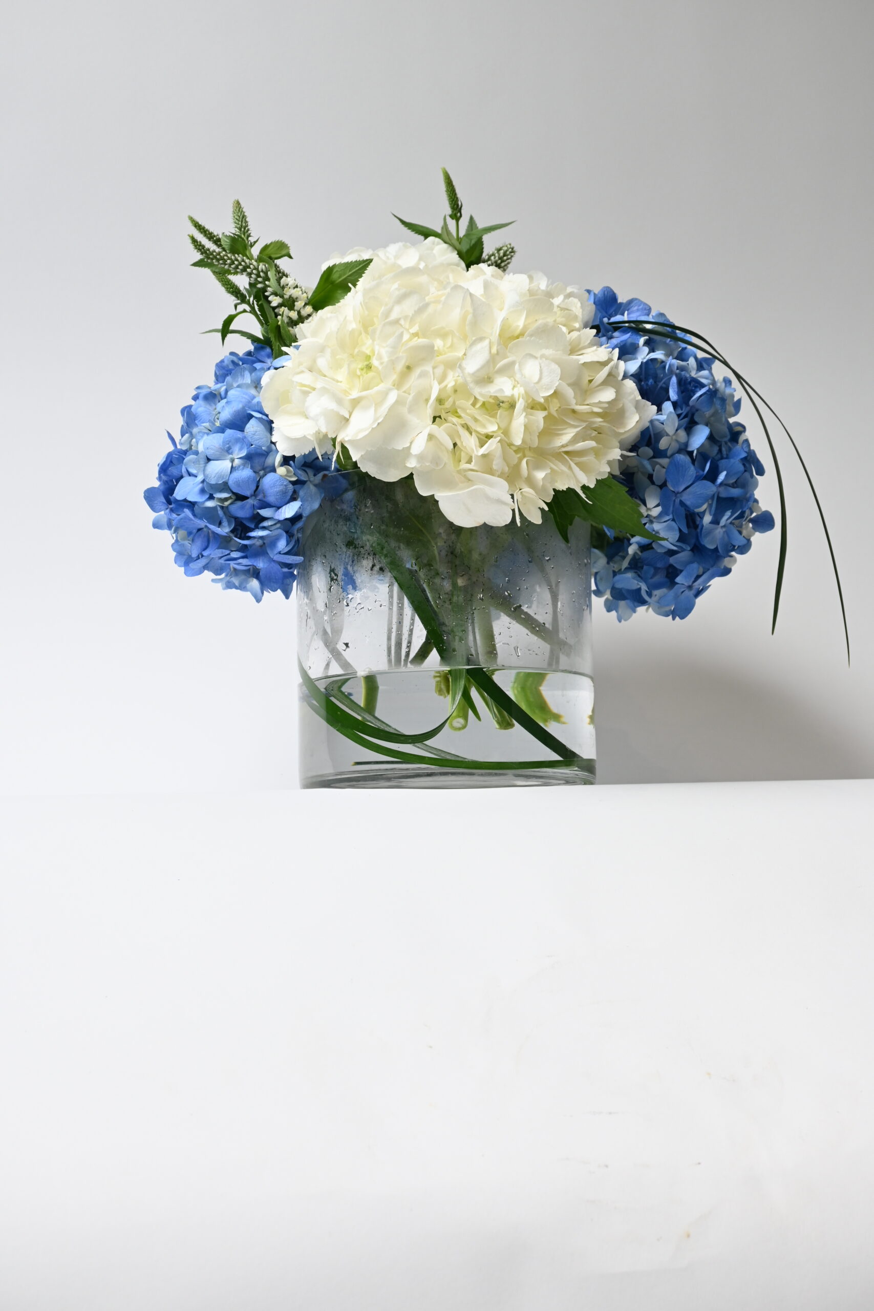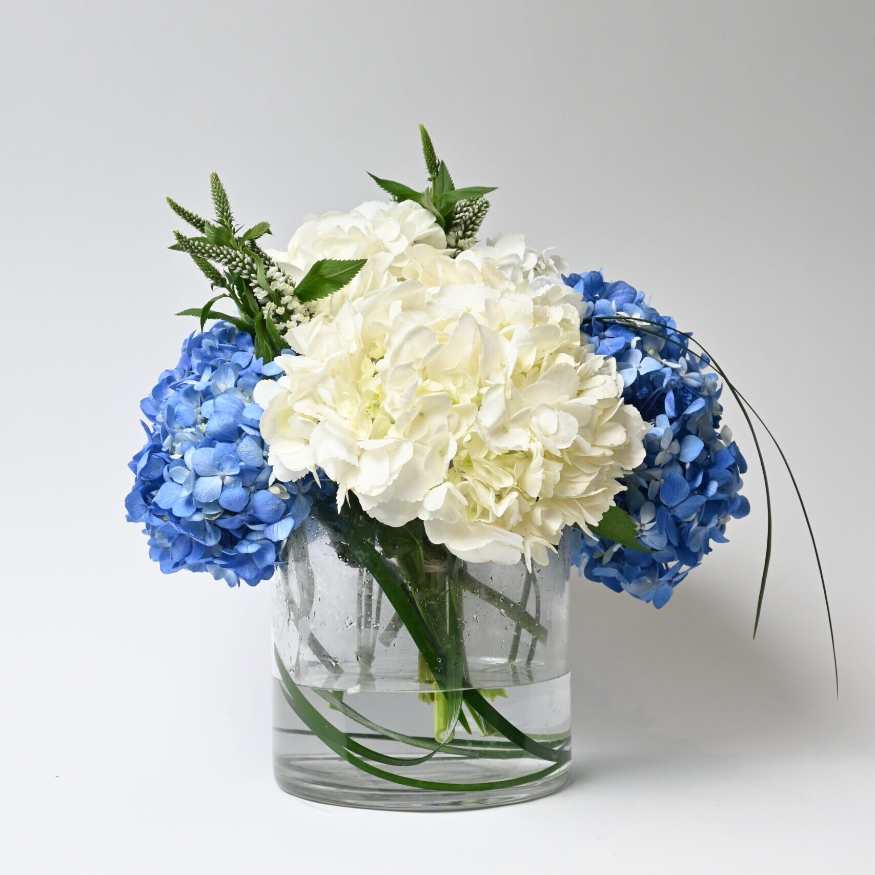 فازة ورد مميزة تحتوي: ” 2 هيدرنجا أبيض – 3 هيدرنجا أزرق – 2 كلاسيك أبيض ”