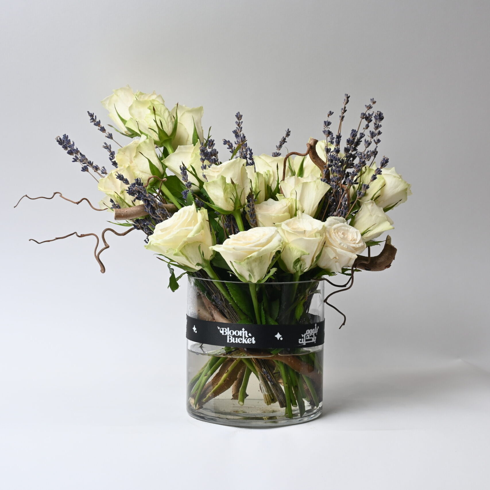 فازة ورد تتضمن ” 40 لافندر – 25 روز – غصن خشبي ”