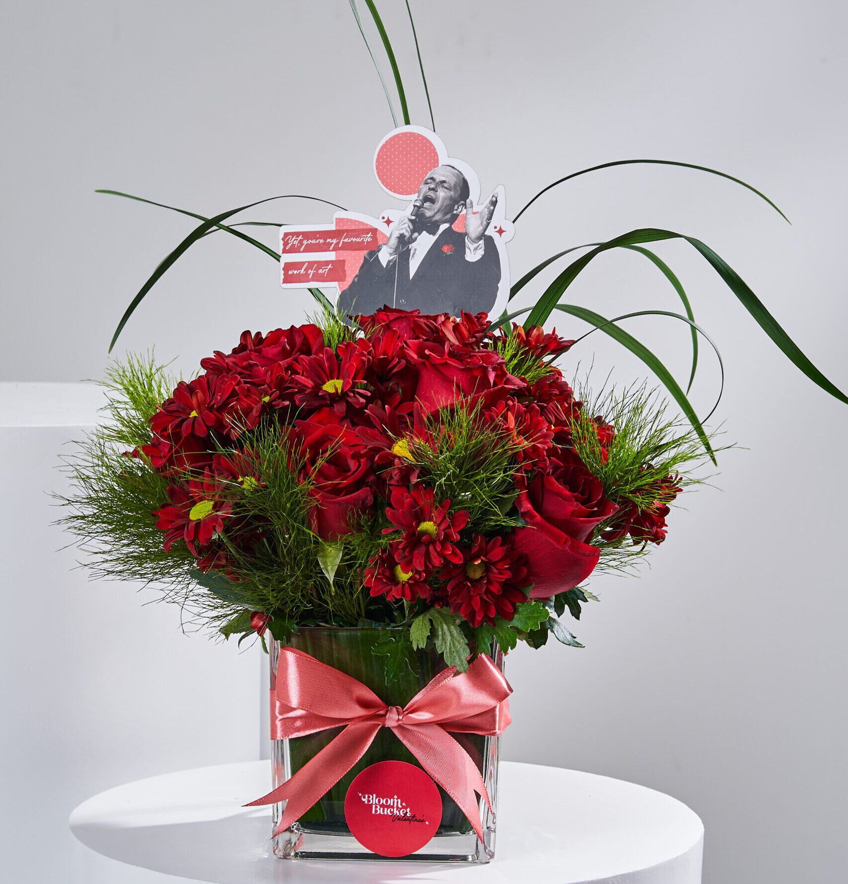 تُبهر هذه المزهرية الأنيقة جميع الحواس بجمالها الأخّاذ. 10 ورود حمراء نابضة بالحياة تُعبّر عن الحب العميق, تتناغم مع 5 أزهار كريس البيضاء الناعمة لتُضفي شعورًا بالهدوء والصفاء. 7 أوراق خضراء تُضفي لمسة من الانتعاش والجمال الطبيعي, باقة مثالية للتعبير عن مشاعرك الصادقة في أي مناسبة مميزة.